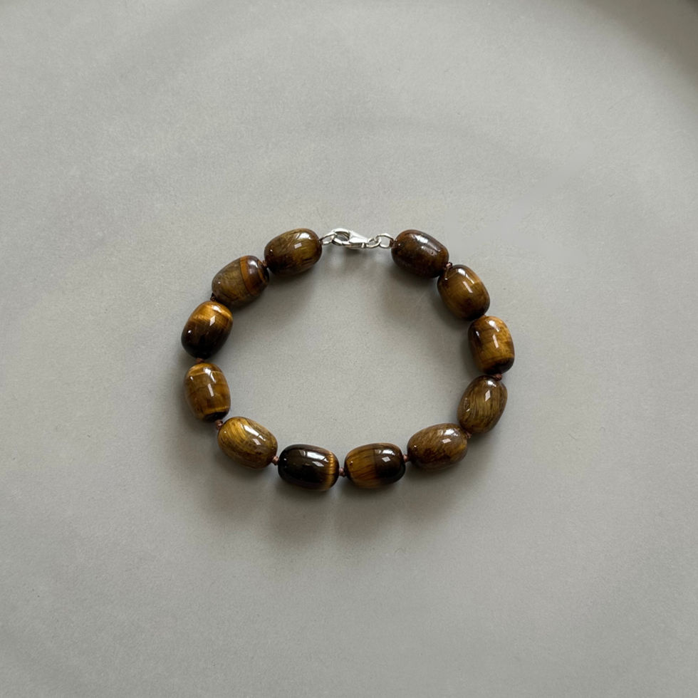 The Forma Bracelet features polished golden tiger’s eye barrel beads, each one a study in warmth and reflection. Hand-knotted on nylon mala cord and finished in sterling silver, it balances fluidity and structure, a design that feels both elemental and refined.