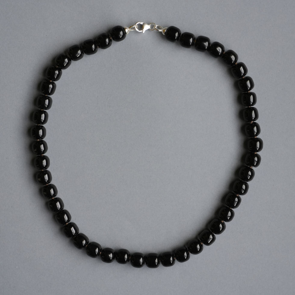Index presents 8×9mm barrel-shaped black agate beads, finished in a high-shine polish that reflects light across an otherwise uninterrupted surface. Completely unbanded, the beads read as uniform and precise - form first, detail second.