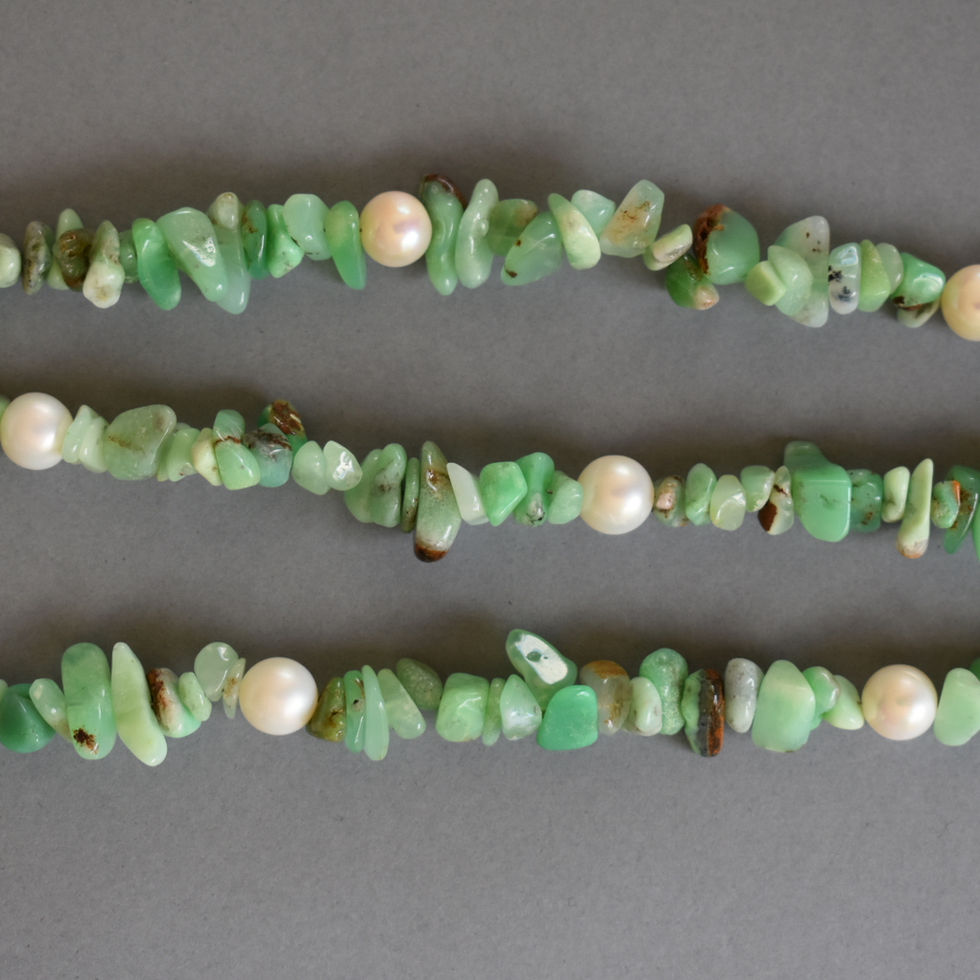 Chunky Australian chrysoprase chips meet AAA-grade near-round white freshwater pearls, each around 9mm, in a strand that feels both earthy and refined. Every bead brings its own character- soft mint greens, natural texture, and that unmistakable chrysoprase glow. Punctuated with luminous pearls that elevate the piece into something striking.