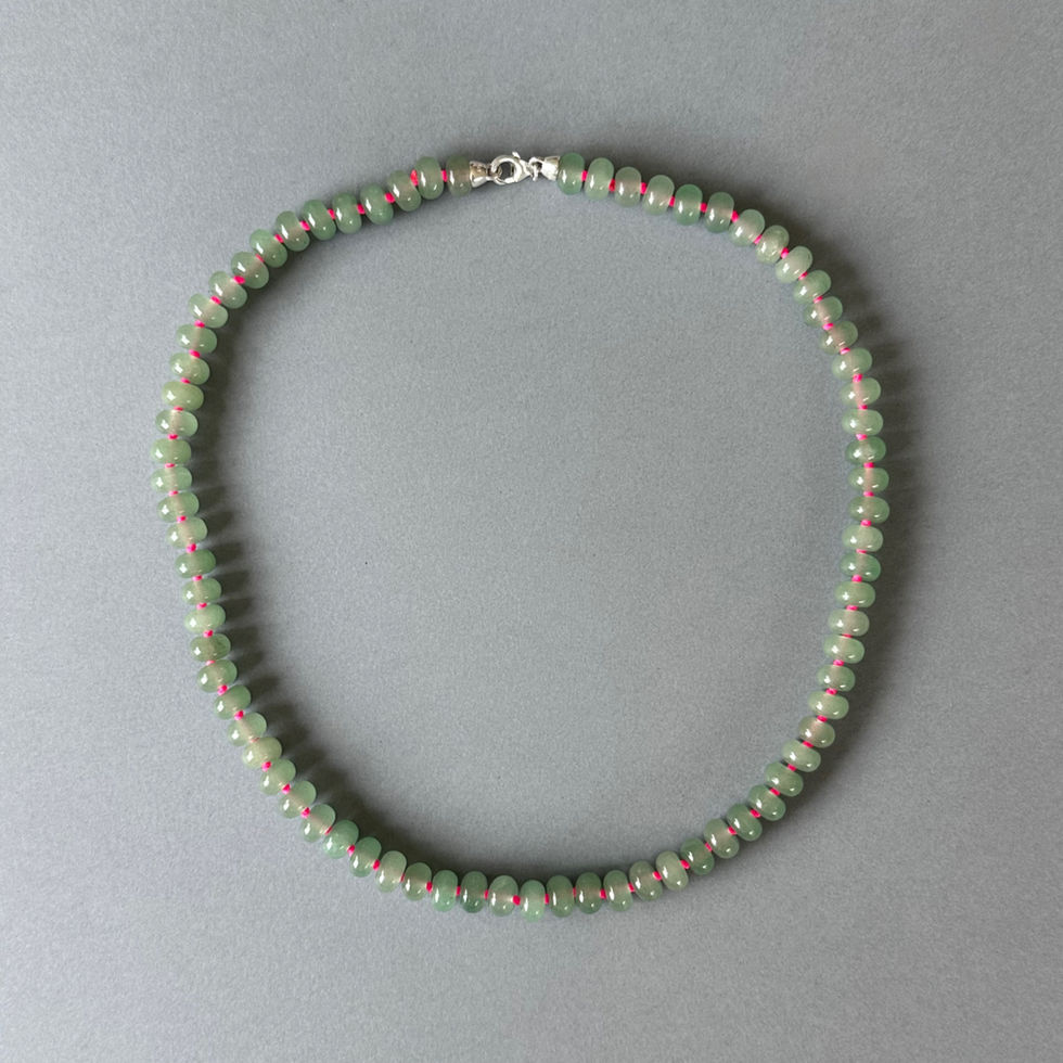 Strung with 8×5mm green aventurine rondelles, Édena brings a grounded, luminous calm to the neckline. Each stone is hand-knotted on a neon-pink thread, a eclectic pairing that feels distinctly modern and a lot of fun.